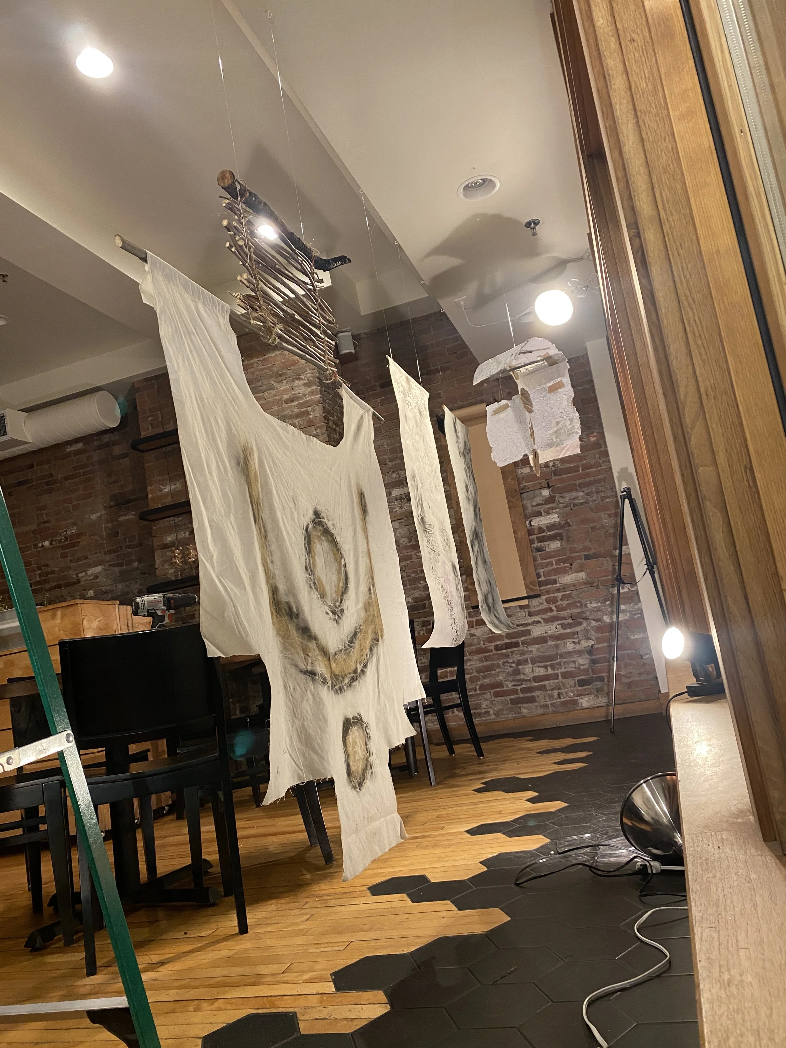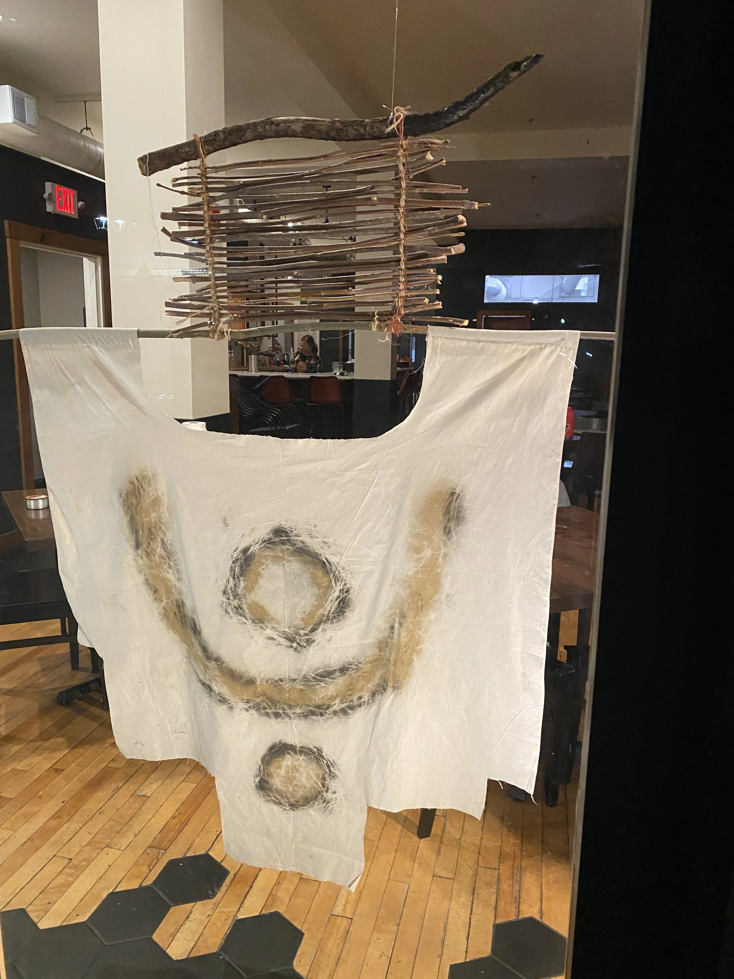 Cotton sheet, elder sticks, spray paint, dyed hemp rope.