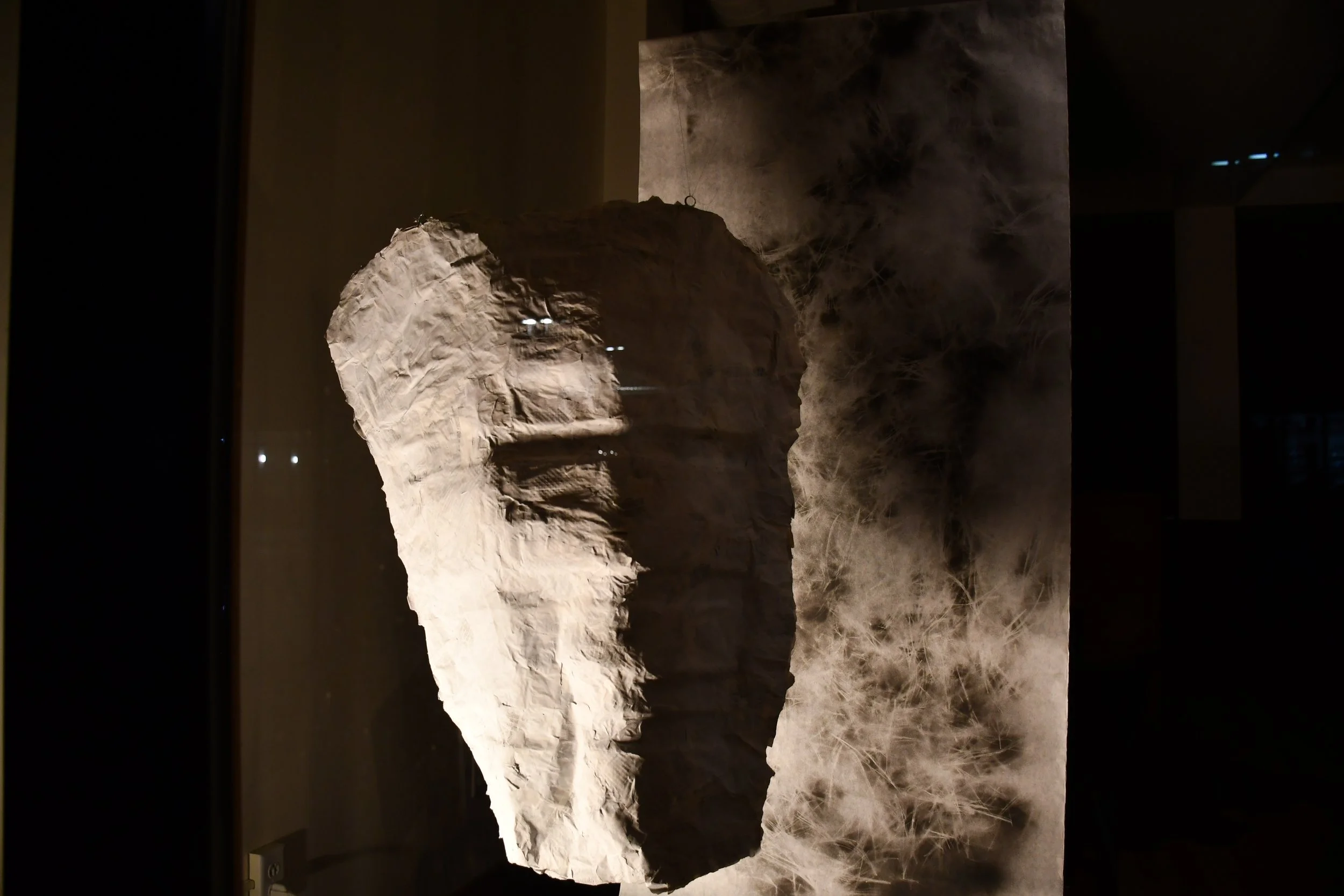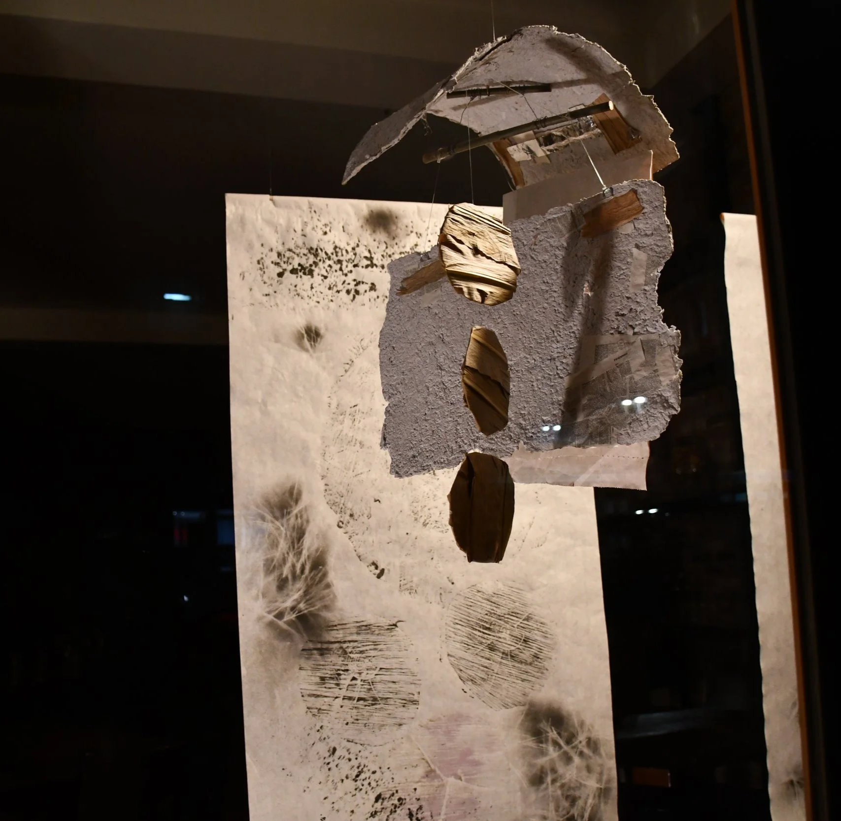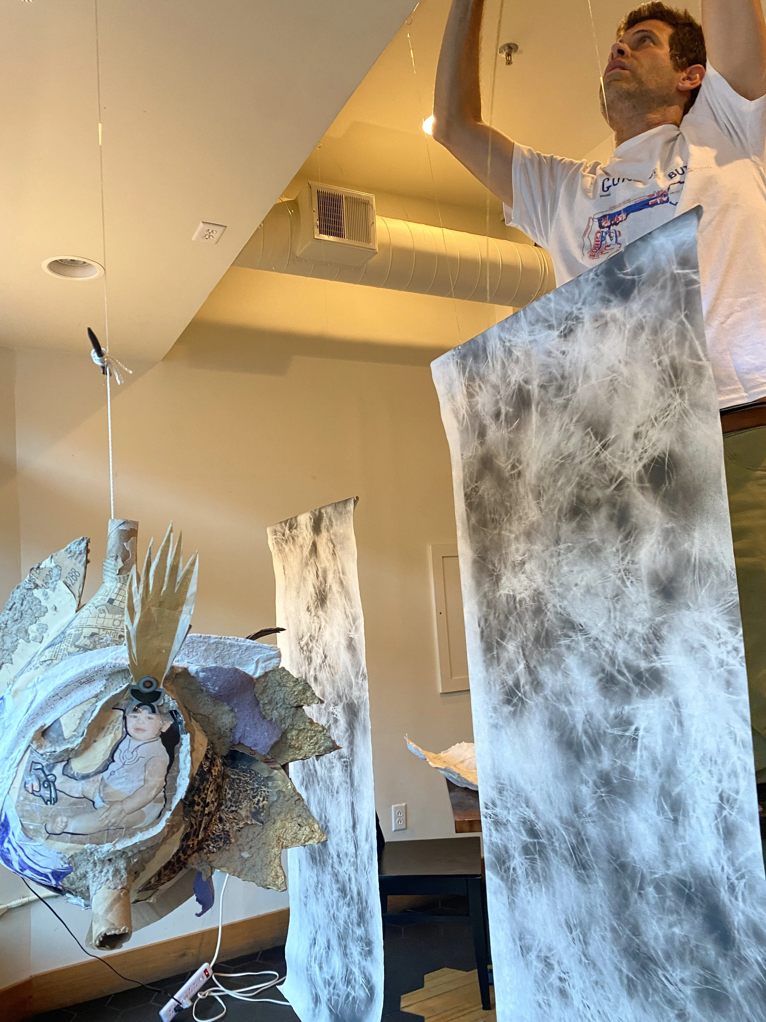 Papier Mâché, cardboard, feathers, linocut, ink jet print